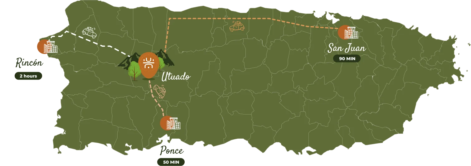 Located in the Utuado region, Ukōa offers breathtaking lake and mountain views in the heart of Puerto Rico’s Cordillera Central. Just 90 minutes from San Juan and 1h 35min from Luis Muñoz Marín International Airport, it’s an escape that’s easy to reach—and hard to leave.